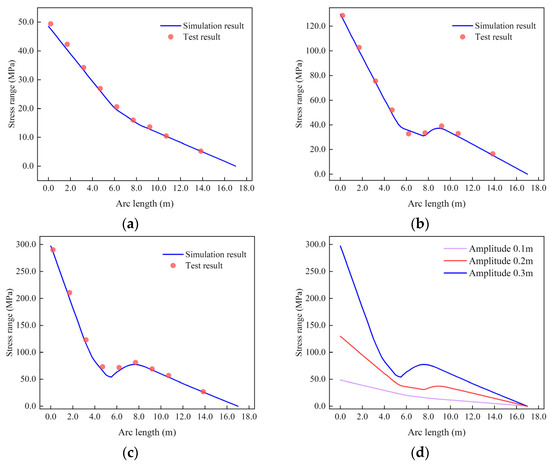 In-plane stress range distribution under different loading amplitudes: (a) 100 mm; (b) 200 mm; (c) 300 mm; (d) comparison of the stress ranges.