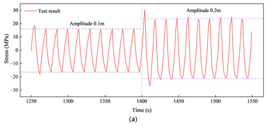 Horizontal cyclic displacement loads with amplitudes of 100 mm and 200 mm were applied to the truncated point. The vertical elevation of the loading end was adjusted to ensure that its center was 300 mm higher than the center of the tail end before the lateral loading. The loading period of 15 s was kept constant throughout this loading stage. Both the horizontal movement and the lateral seabed resistance contributed to stress variation within the model SCR. The time histories of the out-of-plane stress (half of the difference value of the stress obtained by the strain gauges at the left and right of a cross-section) at points S2, S5, and S8 are shown in Figure 32. All the curves were similar to the sinusoids, although the curve of S8 had some oscillation when the riser segment approached the initial position.