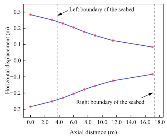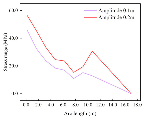 The out-of-plane stress range distributions along the model SCR under different lateral cyclic displacements are shown in Figure 33. The stress range decreased from the loading end and reached the valley point within the middle of the SCR. Subsequently, the sign of stress would change as discussed in the previous section, and the stress range began to increase owing to the horizontal force provided by the seabed and reached a peak value. After the peak, the stress range would decrease again when approaching the hinged end.