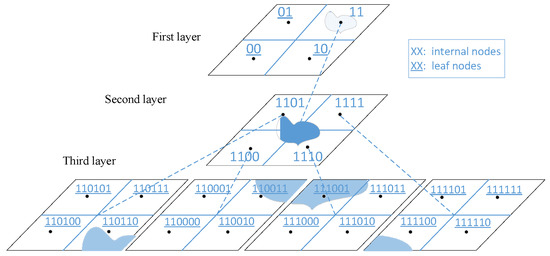 In this research, a quad-tree method is applied to build a graph with finite rectangular regions. The basic idea of the quad-tree is to recursively divide geographic space into different levels of the tree structure. It divides the space of the known range into four equal subspaces, and recurses until the tree reaches a certain depth or does not contain any obstacles. The structure of the quad-tree is simple, and has a high efficiency for spatial data insertion and query. The structure of a regular quad-tree is shown in Figure 1. Geospatial objects are stored on leaf nodes, while internal nodes do not store geospatial objects.