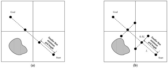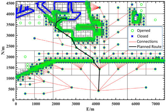 As the demand for precision is different in different positions and environments, multi-scale algorithms are widely applied for searching speed improvements. Reference [18] clarified how to build a quad-tree-based multi-scale map. References [19,20] used multi-scale methods to build maps for unmanned aerial vehicles (UAVs) and wheeled robots, respectively. Reference [21] used a multi-scale Theta* algorithm to plan a path across the Singapore Strait for a USV. They all achieved good planning results.