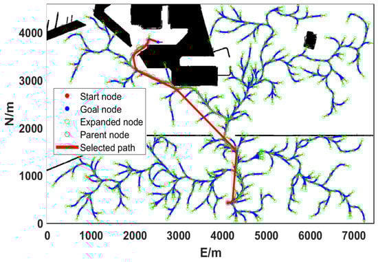 There are two main factors of concern in global planning: motion constraints and searching speed. Motion constraints of a USV consist mainly of kinodynamic constraints and non-holonomic constraints. In [13], an admissible velocity propagation method was proposed, that enabled path-velocity decomposition to discover truly dynamic motions. In [14], a framework was presented to extend a RRT algorithm to plan the motion of a wheeled robot under kinodynamic constraints. In [15], the double S trajectory planning method was proposed, which guaranteed a smooth change of speed and acceleration. For non-holonomic constraints, Reeds–Shepp curves [16] or Dubins curves [17] are commonly used. By setting a maximum curvature, the whole path meets the holonomic constraints.