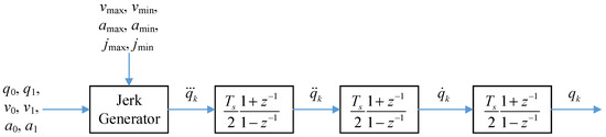 denote the values of position, velocity, acceleration, and jerk at the k-th time instant, respectively, and let Ts denote the sampling period. The structure of the trajectory planner is shown in Figure 11. Given the initial and final values of position, velocity, and acceleration and their constraints (vmax, vmin, amax, amin, jmax, jmin), recursion to the next time step is computed as Equation (3). During the planning process, jerk is only selected from three values, jmax, jmin, and 0, to approach all the desired constraints and values.