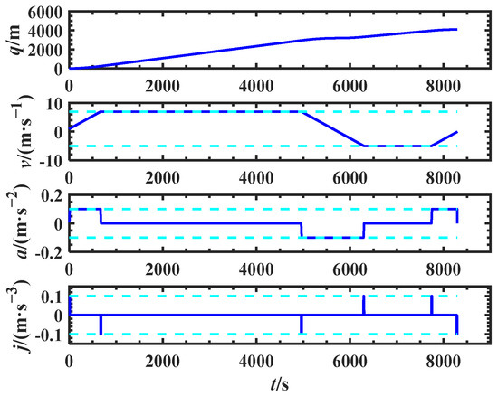 For the path derived by the multi-scale A* algorithm with RSC in Figure 8, the trajectory is planned as Figure 13 and the position, velocity, acceleration, and jerk profiles are given in Figure 14, with constraints , , , , and time interval Ts = 0.1. The planned trajectory is smooth and satisfies the constraints.