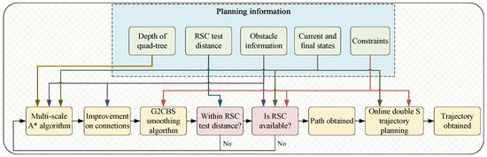 Based on the methods and analysis above, the main contributions of this research are given as follows: (1) a multi-scale planning graph is established through a quad-tree method, resulting in fast searching. (2) Trajectories can be planned with only initial and final states; curvature constraints are satisfied by Reeds–Sheep curves (RSC), and kinodynamic constraints are satisfied by an on-line double S planning method.