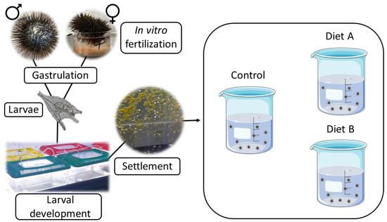 Several attempts to improve larval survival and to develop suitable rearing methods for post-larvae [16], as well as diets and feed ratios [17,18] were made. In addition, it is essential to improve larval diets and feed ratios, because they also affect the survival and growth of post-larvae [19,20]. After fertilization, larvae usually take 18–25 days to reach the competent stage for settlement, shifting to the benthic life [21]. At this stage, suitable environmental cues, such as the presence of macroalgae or compounds emitted by adult conspecifics, may be important triggers to stimulate settlement [11]. While the larval morphology changes, the benthic juvenile stage may start only after the complete development of the mouth and anus, which become functional, along with the completion of the digestive system. During larval growth, sea urchins modify their morphology and feed on microorganisms suspended in the seawater. According to Lawrence et al. [22], many species of cultured algae support the growth and development of larvae up to metamorphosis. Rodhomonas lens, Dunaliella tertiolecta, Phaeodactylum tricornutum, Isochrysis galbana and Cricosphera elongata are the most effective to promote the larval growth in aquaculture plants. However, they show significant differences in terms of effectiveness at promoting development and survival [22]. Larvae are exotrophic, yet after about 48 h post-fertilization, they filter microorganisms in the water column, but post-larvae start to graze algal biofilms immediately after the settlement [11].