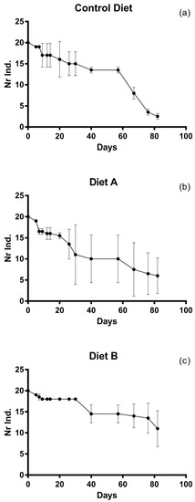 Mortality rates of post-larvae during the experimental period. Dots indicate the average number of individuals for each diet: (a) control diet (U. rigida); (b) diet A (U. rigida, SHG® microperle, Algamac Enrich); (c) diet B (U. rigida, 2% spirulina SHG®).