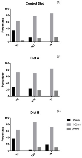 The test diameter of post-larvae feeding on the Control diet (U. rigida) was evaluated at the start of the third phase of the experiment (t0) when most post-larvae (62%) had a size between 1 and 2 mm. By the end of the experiment, post-larval size ranging from 1 to 2 mm increased by 23.7%, and individuals larger than 2 mm accounted for 14.20% (Figure 3a; see also Figure 4). Similar patterns were noticed on post-larvae fed on the second diet (U. rigida + Microperle + Algamac). Their size was between 1–2 mm in most individuals (72%). By the end of the experiment, about 20% of post-larvae were larger than 2 mm, whereas most of them (80%) ranged between 1 and 2 mm (Figure 3b). At the start of the experiment with the third diet (U. rigida + spirulina), more than half post-larvae (63%) were between 1 and 2 mm, and only 35% were smaller than 1 mm. Interestingly, at tf, post-larvae wider than 2 mm accounted for 11% of the total, while there was an increase of roughly 22% of individuals in the range of 1–2 mm (Figure 3c).