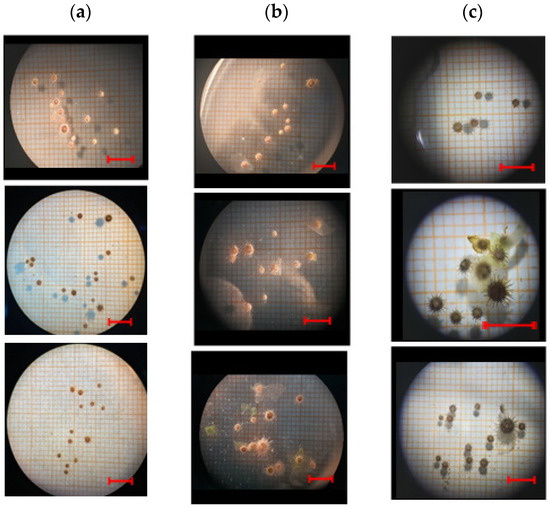 P. lividus post-larvae size captures at t0, tf/2 and tf in the replicates of (a) control diet, (b) diet A and (c) diet B. The red scale bar measures 10 mm, according to the magnification under optical microscopy.