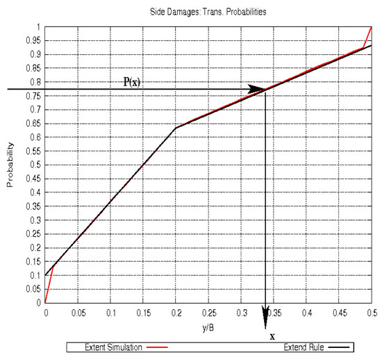 The algorithm we have described above would now result in the situation that this case is one sub damage case amongst others for the related full extent damage case. The probability pi(x1,x2) is obtained from the full extent case, and our methodology would result in zmax = 16.20 m for this particular case, resulting in vi = 1 and ri according to Equation (3). This result is obviously a possible and a reasonable result at the same time, but it differs from a conventional damage stability calculation: From the viewpoint of a manual damage case generation, the damage case “steering gear compartment” must be divided into two separate damage zones to correctly obtain the three individual probabilities. The Monte Carlo simulation is due to its principle able to deliver the total probability Pi correctly, but the splitting of the total probability into the three individual probabilities does obviously depend on the splitting of damage cases into longitudinal damage zones. We will later show that a comparable problem exists for the transversal penetration, too. The following subsections show how these difficulties can be overcome in the framework of the Monte Carlo simulation.