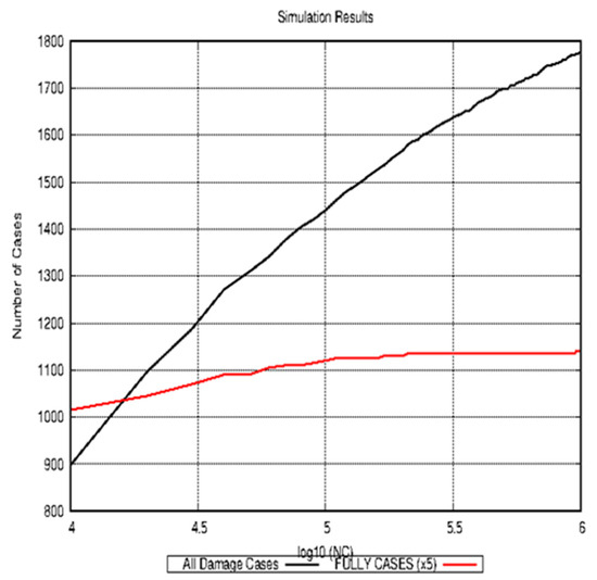 Simulation results for the EMSA2-RoPax. Black curve: Number of damage cases. Red curve: 5× Number of “fully” damaged cases.