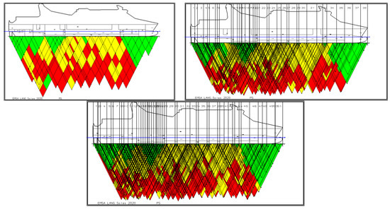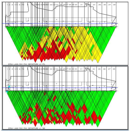 Figure 7 shows the graphical output of the damage stability simulations for three different configurations of damage zones. The picture on the top left shows the results if no damage zones have been defined. This is the setup of the classical Monte Carlo simulation method, but with the realization of the full extent damage cases. Each full extent damage case has a certain number of subcases. If the majority of these subcases is survived, the damage triangle is plotted in green, and if the majority is not survived, the triangle is red. All others are plotted in yellow. In this context, “majority” means the computation of an average Si,av for all damage cases of that group. The limit values can be set by the user, and the defaults which are also used in the following figures are Si,av > 0.85 for a green triangle and Si,av < 0.3 for a red triangle.