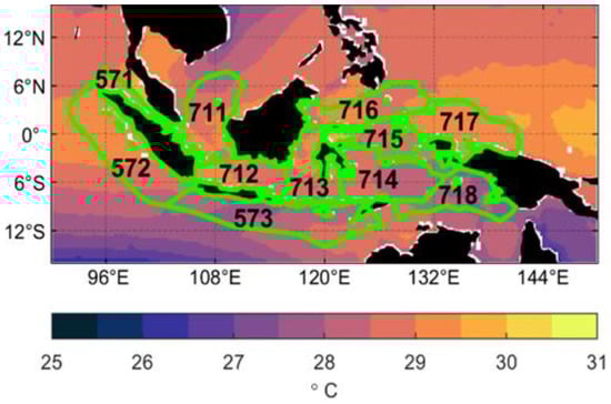 We used 11 FMAs in the Indonesian territory (Figure 1) as our area of interest (AOI). FMA 571 covers the Malacca Strait and the Andaman Sea; FMA 572 covers the Indian Ocean west of Sumatra and the Sunda Strait; FMA 573 covers the Indian Ocean south of Java to the south of Nusa Tenggara, the Sawu Sea, and the western part of the Timor Sea; FMA 711 covers the Karimata Strait, Natuna Sea, and the South China Sea; FMA 712 covers the Java Sea; FMA 713 covers the Makassar Strait, Bone Bay, Flores Sea, and the Bali Sea; FMA 714 covers Tolo Bay and the Banda Sea; FMA 715 covers Tomini Bay, the Maluku Sea, Halmahera Sea, Seram Sea, and Berau Bay; FMA 716 covers the Sulawesi Sea and the north of Halmahera Island; FMA 717 covers the Bay of Cendrawasih and the Pacific Ocean; and FMA 718 covers the Aru Sea, Arafura Sea, and the eastern part of the Timor Sea.