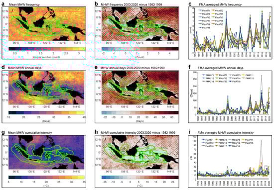 Various metrics that explain MHWs characteristics, such as the frequency of events, MHW days, and cumulative intensity, can be described in terms of trends or the difference between two time slices [11]. In general, there was an increase in the intensity, frequency, and duration of MHWs across FMAs from 1982 to 2020.