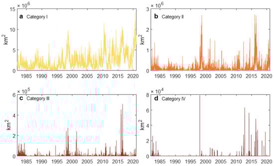 The trend in the coverage area of each category showed a significant increase. The difference in the average percentage of MHWs coverage area in 2003–2020 and 1982–1999 in category I was , category II , category III , and category IV . In addition, it can also be seen that the area affected by MHWs was greatly influenced by the ENSO phenomenon, especially in 1982–1983, 1997–1998, 2009–2010, 2015–2016, and 2019–2020. This result is in line with previous research conducted globally or regionally [11,14,24].