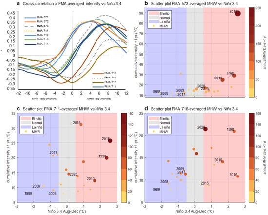 Cross–correlation between Niño 3.4 and FMA averaged MHWs (a), scatter plot between FMA573 (b), FMA 711 (c), FMA 716 (d), averaged MHWs vs. Niño 3.4. Blue shades indicate negative phase (La Niña), red shades indicate positive phase (El Niño), and grey shades indicate neutral phase.