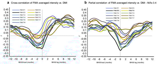 Cross–correlation between DMI– and FMA–averaged MHWs (a), partial correlation between DMI– and FMA–averaged MHWs minus Niño 3.4 (b).