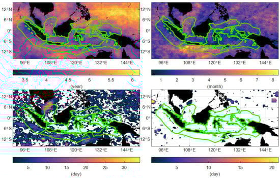 In FMA 573 (Figure 4b), the cumulative intensity of MHWs in from May to September ranged from 10 °C to 30 °C. ENSO decay was associated with an increase in the intensity and total duration of MHWs in the years of ENSO decay. In 2016, the cumulative intensity of MHWs from May to September reached 90 °C, and the total duration of MHWs in that year reached 250 days, or about 8 months. In 1998 the average intensity of MHWs from May to September reached 30 °C, with the total duration of MHWs in that year reaching 60 days. Likewise, in 2010, the average intensity of MHWs from May to September reached around 25 °C, with a total duration of 50 days. Meanwhile, in the La Niña decay years, there was no increase in the intensity of MHWs and no increase in the total duration of MHWs. In FMA 716 (Figure 4d) the same pattern also occurred, except in 2016, although it was preceded by an extreme El Niño event in the previous year. MHWs with the longest duration were detected in 2020, without being preceded by a strong El Niño event in 2019. The exception was in 2017, when there was an extensive MHW event, although in 2016 there was no strong El Niño event. However, in other years the same pattern remained; namely, more MHWs in El Niño decay years and MHWs in La Niña decay years tended to have a small intensity and very short duration. FMA 711 had mixed characteristics between the FMA 716 and FMA 573 regions. In 2020, there were no strong MHWs in FMA 573, but they occurred in FMA 711 due to the influence of the western Pacific region. In 2017, although there were MHWs in the Pacific, FMA 711 (Figure 4c) did not detect a similar event, rather like the MHWs event in FMA 573. In general, however, ENSO decay can be associated with an increase in MHWs. The cross-correlation between the spatially averaged MHWs against the Niño 3.4 SST index (Figure 4a) indicated a lag between ENSO activity and the occurrence of MHWs. The lag ranged from 2 to 10 months. The FMA 711 region experienced the shortest lag, ranging from 3 to 4 months. Meanwhile, the FMA 573 region experienced a longer lag, reaching 6 to 10 months. However, the largest correlation value was found in FMA 573 at a lag of 8 months. This means that the area off the southern coast of Java received the strongest influence from ENSO. The teleconnection between the Pacific Ocean and the Indian Ocean via the Indonesian Throughflow (ITF) is suggested to be the driver of MHWs. This is supported by previous studies revealing the strong negative correlation between ITF transport anomaly and ENSO variability. In FMA 573, there was a strong correlation between ITF transport and Niño 3.4. with a 6 to 8 month lag [25]. Using the ocean model result, it is also suggested that ITF lags behind ENSO by 8 to 9 months [26]. The correlation value between ITF is negative due to the southward flow direction. Observations from many in situ data also reveal that ITF in the outflow region lags behind ENSO by 4–8 months [27].