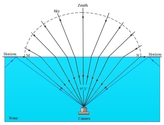 Imaging through a water surface, light ray transmission follows Snell’s Law [35,36]. When the water surface is flat, the field of view of a submerged camera only needs , which can observe the whole sky scene regardless of the observer’s depth. As shown in Figure 1, a submerged camera observes from an underwater location of . and are the total reflection boundaries, where . The conical area formed by the rotation of and around the optical axis is called the Snell cone, and the circular area on the water surface between and is the Snell window (SW), the boundary of which is the extinction boundary. SW is surrounded by a dark region that represents light that is entirely internally reflected from the sea and back to the observer from the water below.