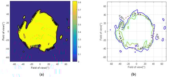 where represents the radiant emittance of the objective scene located at , . is the brightness of the corresponding pixel. and are the angle of incidence and refraction, respectively. Figure 2 shows the contour distribution of irradiance on the image plane. Among them, WAI is numerically simulated based on the wave spectrum theory [38,39] by a wind speed of , and the water depth of the camera of .