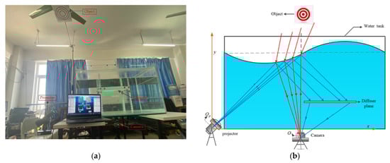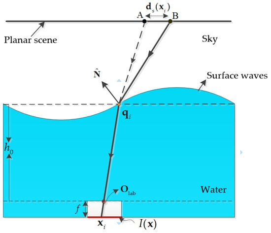 The projected ray and the reverse projected ray of the pixel point intersect the same point on the WAI; hence, in the presence of surface waves, the displacement amounts and are only related to the slope and height of the intersection point and the height of the diffuser plane .