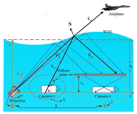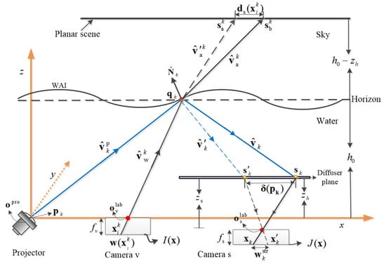 As Figure 4 shows, similar to our previous work [6], we first introduced a water–air imaging model with structured light projection to simultaneously acquire the distorted structured image and the warped scene image. In which the camera s obtains the warped structured light image from the diffuser plane, while the camera v acquires the scene image through the same sampled region. Next, we will describe in detail how the algorithm works.