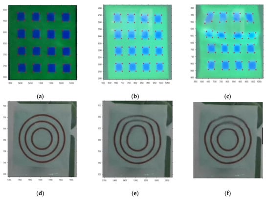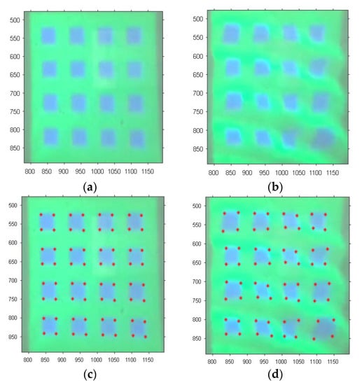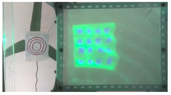 A distorted structural light image will be formed in the diffusion plate plane after reflection through the water surface, as shown in Figure 6. Then, feature point extraction and matching were performed on the reference and the twisted structured light images using a new corner detection algorithm (described in Section 3.3.1), respectively. Thereby, the displacement field of the feature points in the structured light image can be expressed as