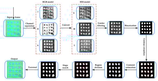 The framework of the feature-extraction method is shown in Figure 7. Firstly, distorted structured light images are converted to an HSI color model from an RGB color model, where is the hue, representing the frequency of the color; represents the depth of the color, called saturation; and represents the intensity or lightness. The HSI model can be given as