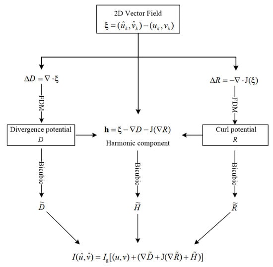 The Helmholtz–Hodge Decomposition of vector fields is one of the fundamental theorems in fluid dynamics, which has been widely used in various fields [47,48,49,50]. Viewing the scene above water with a submerged camera, ignoring the absorption and scattering of water, the essential reasons for image distortion can be attributed to the following three aspects: (1) the height variation of the water surface; (2) the whirlpool of water; (3) the relative position of the camera and the WAI. In 1858, Hermann von Helmholtz et al. [51] first explained the connection between fluid motion and vector field decomposition. From the perspective of fluid mechanics, this paper proposes an image restoration algorithm based on the Helmholtz–Hodge Decomposition. The algorithm flow is shown in Figure 9.