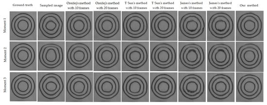 In order to more accurately evaluate the performance of our method and its scope of application, we further compared our experiment results with other state-of-the-art methods, such as Oreifej’s Method [7], Tao Sun’s method [11], and James’s methods [19]. It should be noted that these methods [7,11,19] require that the input parameter is not a single image but an image sequence, while our method is only used to recover the single instantaneous scene image. Considering the recovery result of the same sampled frame, we took the sampled frame at a specific moment as the center, selected a certain length of image sequence forward or backward as the input sequence of the previous methods [7,11,19], and then compared the restoration result of the corresponding frame with our method. Moreover, we also considered the image processing time to evaluate the computing efficiency, in which all of the above methods were performed in the same operating environment, which contains a CPU (i7-6700HQ) and RAM (8GB).