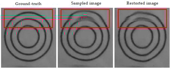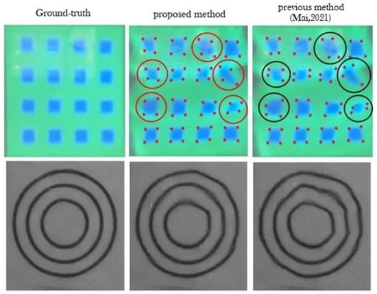 As we all know, the accuracy of feature point extraction will affect the quality of the restoration results of an image. In [58], a corner detection algorithm based on Euclidean distance was used to solve the feature extraction problem of distorted structured light images, and compared with other classic algorithms, such as SURF, Harris, and SUSAN, it was proven that the method performs better than the classic algorithms. However, as shown in Figure 15, we found that there are still misdetection problems (purple marks) in the detection results, which directly reduce the restoration accuracy and visualization effect of the corresponding scene image. On the contrary, the corner detection scheme proposed in this paper can effectively correct this problem (red mark), and compared with the previous work, the image restoration results are significantly better. Moreover, compared with the ground-truth image, there are still several residual distortions in our results, which means that we can further improve our corner-detection scheme to optimize our restoration result.