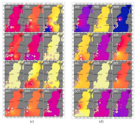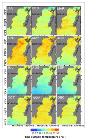 During the northeast monsoon period, the distribution of sea surface temperature in the MS waters was high. It increased again specifically in April, especially in the western part of the MS. The temperature distribution ranged from 31–32 °C, with the highest peak in April. From June until September, the sea surface temperature decreases, and there is a difference between the northern and southern parts of the MS. The north part of the MS has a higher temperature than the south part. Then, in October, the distribution of sea surface temperatures increased again until December. The highest average sea surface temperature distribution occurs in April, while August has the lowest sea surface temperature distribution. The weakening of the seasonal wind speed in April makes solar radiation more effective, causing high sea surface temperatures in that month [26].
