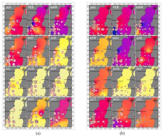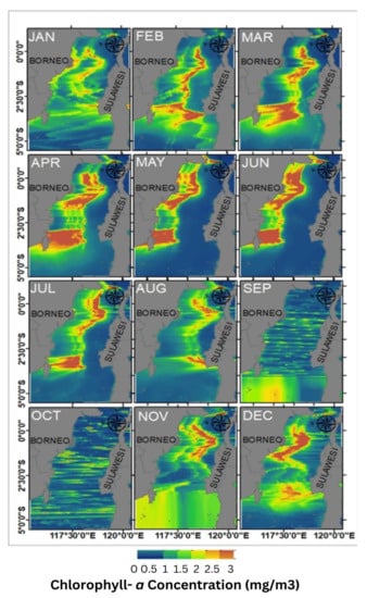 The distribution of chlorophyll-a moves to the eastern part of the MS in the southeast monsoon with lower concentrations. Then, at the end of the northeast monsoon, the chlorophyll-a concentration again decreased with more even distribution throughout the waters. This means that this period has the lowest chlorophyll-a concentration. Meanwhile, the distribution of the highest concentration of chlorophyll-a occurred in December. Chlorophyll-a, which tends to increase from March to June, is caused by high rainfall, estimated to bring many nutrients from the mainland or the surrounding islands [27,28].