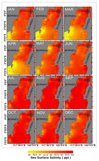 Based on the spatial distribution map of the average salinity in (Figure 4) in general, the salinity value in the MS waters in 2015–2020 has a pattern based on seasons. In the middle of the northeast monsoon in December, the average salinity value is high. Then from January until the beginning of the southwest monsoon (May), the average salinity value has lower value in the southern part than in the northern part of the MS. When the water mass with high salinity enters from the north of the MS, it prevents the lower-salinity water mass from the Java Sea from reaching the eastern part of the MS [31].