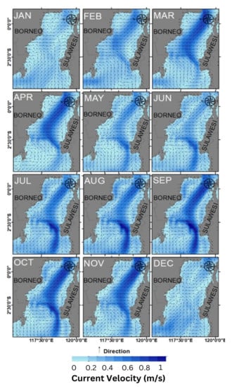 The Spatial Distribution Map of Average Current Direction and Velocity 2015–2020 in the Makassar Strait.