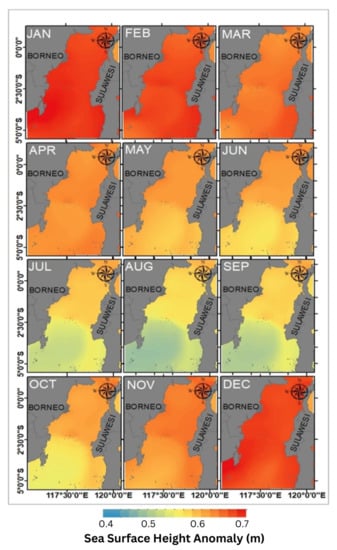 In January, the red gradient means the sea level anomaly is at a high number of 0.7 m. From February until May, the sea level anomaly decreased. The sea level anomaly is low in the east monsoon, with differences in sea level in the north and south of the MS. The same thing happened until the middle of transitional season II. Then, the sea level anomaly increased in November with an average distribution of 0.56 m. The sea level anomaly increased again in December, with a figure of 0.64 m. The difference in sea level in the waters of the MS is caused by the difference in pressure between the two water masses originating from the Pacific Ocean and the Indian Ocean. The difference in sea level is at its maximum point during the east monsoon period until the beginning of the transition season (May to September) when the southeast monsoon occurs [36].