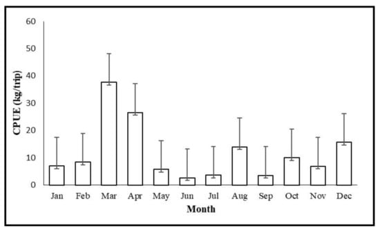 Little tuna (Euthynnus affinis) monthly CPUE chart in 2020. Error bars indicate standard deviation.