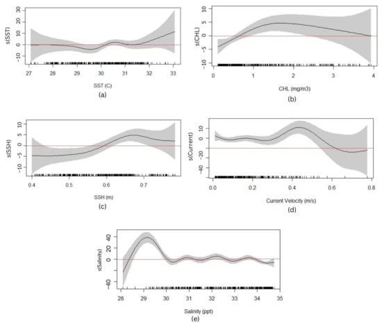 GAM was made from the mgcv package using R software, with catch data as the response variable and SST, chlorophyll-a, salinity, current velocity, and SSHA as predictor variables. The equation used is: