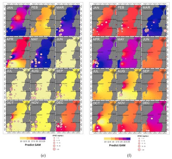 Based on this discussion, it can be concluded that the relationship between optimum oceanographic parameters and the catch of Eastern Little Tuna (Euthynnus affinis) based on GAM analysis for the sea surface temperature is between 30–31 °C and the chlorophyll-a is between 1–2 mg/m3. Additionally, the optimum value for the salinity is 29–30 ppt, current velocity is 0.3–0.5 m/s, and sea-level is between 0.6–0.7 m. Based on the GAM model formed, the model with five variables (SST, chlorophyll-a, salinity, current, and TML) is the most suitable model for the prediction area for Eastern Little Tuna fishing with a Cumulative Deviance Explained value of 16.4%. Salinity in the waters of the Makassar Strait is the predictor variable with the highest influence on Eastern Little Tuna catches with a significance value of <2.00 × 16−10. Based on the prediction model and map, March to May is the season with the highest predicted CPUE value. In contrast, the southwest monsoon (June to August) is a seasoning period with the lowest CPUE value.