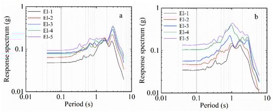 From the response spectra at different depths in Figure 4, Figure 5, Figure 6, Figure 7 and Figure 8, we can see that the response spectra of the two groups of models were basically the same at the start. On the whole, the spectrum shape showed a trend of gradual increase and then decrease. With the increase in the input peak ground motion, the response spectra of the models with and without water at the same depth also increase. Under the same working conditions, the response spectrum of the model without water is smaller than that of the model with water. Under different conditions, with the increase in the peak value of the input ground motion, the amplitude of the response spectrum decreases.