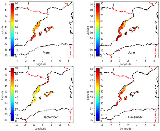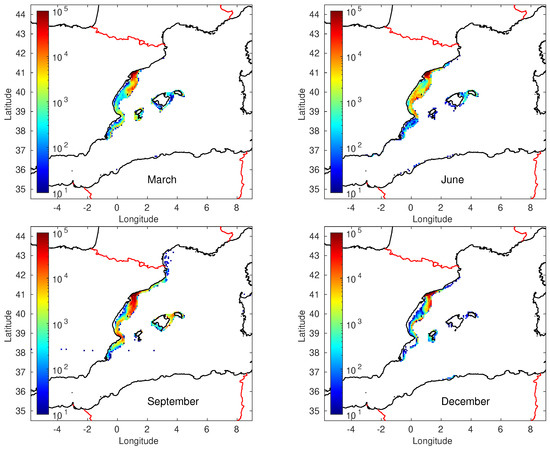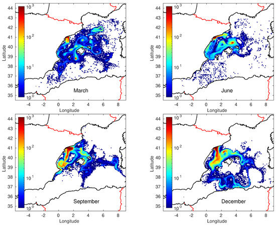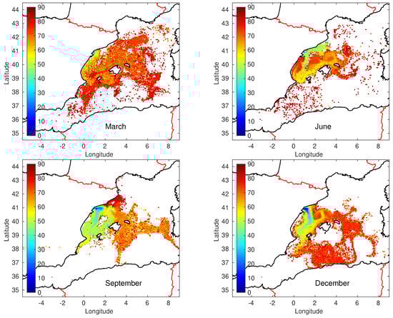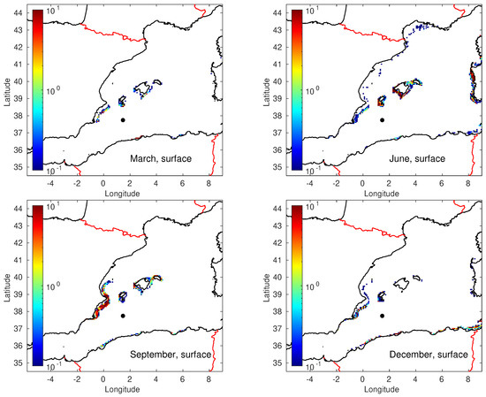 The age distributions in Figure 3 help to visualize the transport pathways. Of course, the extension of the colored map is the same as in Figure 2 since age is zero in grid cells where there are not radionuclides. It must be taken into account, however, that age distributions do not represent a snapshot of water circulation at a given time since the release lasts three months. As a consequence, these age distributions are an integration of circulation during these three months. For accidents starting in March and December, it can be seen that the most recently released radionuclides (blue–green colors) traveled to the south. Older discharges (orange–red) traveled around the Balearic Island in a rather symmetric form. In the case of the accident starting in September, it can be appreciated that the integrated circulation in the period is cyclonic around the Balearic Islands: the older radionuclides are close to the northwest coast of Spain and there is gradual transition to younger ages around the Balearic Islands. The most recent radionuclides also traveled to the south from the source, as in previous cases. If the accident starts in June, some old radionuclides return close to the south of the release area, although old radionuclides are also present to the east and northeast of the Balearic Islands as well as close to the African coast. In addition, there is a transition in the circulation in the release area from southwards to northwards in the last stages of the accident.