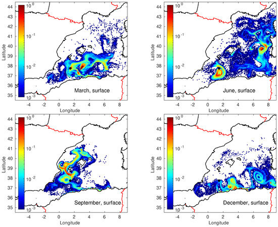 Measured Pu concentrations in the surface waters off Monaco (northwestern Mediterranean) are on the order of Bq/m [39]. Thus, this accident would lead to concentrations higher than those measured in Mediterranean waters in significant parts of the sea. These enhanced concentrations would also reach the coast on some occasions, for instance, the Algerian coast in the March, September, and December accidents, and a small fraction of the Spanish coast in the September accident.