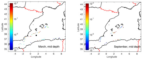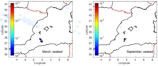 If the release occurs at mid-depth of the water column (1500 m) or close to the seabed (2990 m), radionuclides do not reach the surface water layer in any case. The resulting Pu concentrations in bed sediments for the mid-depth release are presented in Figure 8 for the March and September accidents. Both distributions are very similar, and the same happens in the cases of the June and December accidents (not shown). It can be concluded, therefore, that seasonality does not influence the results in these cases. Sediments of the 1500 m isobath are contaminated when water containing traces of Pureaches them. Nevertheless, peak concentrations are about one order of magnitude higher than if the release occurs at the sea surface (compare the color scales in Figure 7 and Figure 8).