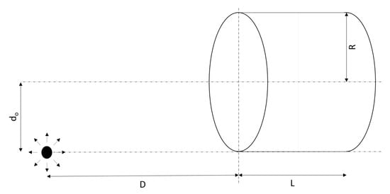 Provision, therefore, needed to be made for the measurement of sediment located at an off-center position to the detector entrance window, as seen in Figure 2. The gamma rays that are emitted by the sediment can be approximated as a point source, which is located at a distance D from the entrance window of the detector. This source is then located at an off-center distance of d0 when the detector is dragged horizontally among the sediment. An increase in D will also significantly increase the gamma ray attenuation by the water [21]. The attenuation of an incident gamma ray (I0) is given by Equation (1) [22]