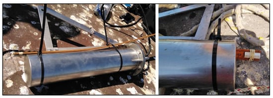 The DUGS consists of a 3″ × 3″ NaI(Tl) scintillation detector, photomultiplier tube, off-the-shelf TB-5 multichannel analyzer (MCA) from Amptek®, interface logic, and accompanying power electronics all enclosed in a waterproof enclosure [12]. The system was designed to be dragged among the aquatic sediment and should therefore not only be able to withstand the hydrostatic pressure, but also the impact from rock outcrops and debris. Grade 316 stainless steel was consequently selected for its strength, pressure, and corrosion tolerance. To minimize the gamma ray attenuation from the enclosure, the thinnest possible wall thickness was selected for the section of the enclosure where the detector is located. A commercial stainless-steel cylindrical pipe was selected for this section, and due to its fabrication tolerances, the minimum wall thickness was found to be approximately 1.5 mm. To improve the hydrodynamic drag of the system, and to provide additional protection against impact, the front of the detector system was equipped with a stainless-steel cone of 4 mm wall thickness. The system is pulled by a rope that connects the cone to the boat. Communication with the detector system is established through Ethernet over a Cat5e cable, which also delivers power to the system through power-over-Ethernet (PoE). To prevent excessive roll that could potentially damage the power and data cable entering the enclosure through the center of the cone, a wing with a righting buoy was attached to the top of the enclosure. The righting buoy can also be used for system recovery. The spectral data were analyzed using customized software running on either a laptop or tablet. Figure 1 shows an isometric view of the enclosure, along with a simplified block diagram of its components.