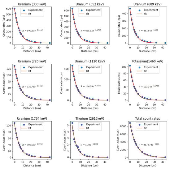 Figure 4 illustrates the count rates in the 40K photopeak, the highest energy photopeak of 232Th, and the prominent 238U photopeaks, as the source-to-detector distance (D) is increased at an off-center distance (D0) of 38.1 mm from the entrance window. The functions fitted to the data are also shown in Figure 4 and indicate an exponential decrease in count rates in each photopeak as the distance is increased. A similar trend is also observed in the total count rates. While these functions bear similarity to Equation (1), they not only include the attenuation from the water, but also the reduction in counting efficiency as the source-to-detector is increased along with a reduction in solid angle due to the off-center location of the source. This exponential decrease in count rates can therefore be represented by Equation (2):