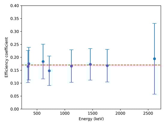 Typically, the mass attenuation coefficients are expected to decrease with an increase in photo energy [24]. It is therefore surprising that the efficiency coefficients of all the energy peaks are within 10% of each other, as can be seen in Figure 5. Further study is required to explain this phenomenon, but it could be related to the detector’s intrinsic efficiency and its dependence on detector-to-source distance. Assuming a point source, numerous Monte Carlo simulations have shown that the detector’s intrinsic efficiency decreases with an increase in distance (D), reaching a minimum at D/R ≅ 0.7, with R the radius of the detector. After this point, any further increase in distance will increase the intrinsic efficiency, even exceeding the initial intrinsic efficiency at D/R > 10 [17]. A similar ratio was also found for multiple off-axis positions [18]. A possible explanation is that at this distance, the directions of the photons impinging on the surface of the detector are parallel to its axis. This implies that all photons will travel the same distance inside the detector. Therefore, for a given energy, the intrinsic efficiency calculation becomes independent of distance and off-axis angle. The increase in the distance also increases the probability of Compton scattering in the water from the higher energies into the lower energy peaks.
