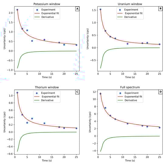 The uncertainty in count rate as a function of accumulation time for the (A) uranium, (B) thorium, and (C) potassium windows. The uncertainty in the full spectrum is shown in (D). The uncertainty was determined by calculating the standard deviation of the count rates.