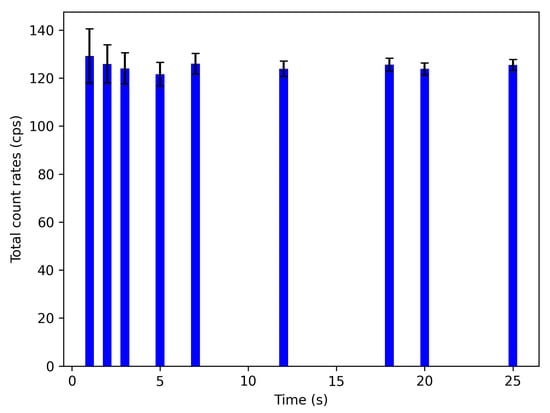 The count rates of the spectra at different accumulation times were extracted and the uncertainty was calculated. Figure 6 shows the variation of the count rate uncertainties at different accumulation times in selected energy windows. As expected, the results showed a high uncertainty in the count rates at 1 s, which was greatly reduced at 25 s. It also showed that the uncertainty decreases sharply between 1 s and 5 s, after which it starts to stabilize. Increasing the accumulation times beyond this point, therefore, does not significantly improve the uncertainty. Short accumulation times will also decrease the spatial resolution of the system. The optimal accumulation time is therefore the time at which the gradient of the uncertainty plots starts approaching zero. The derivatives of the plots are also shown in Figure 6, and the optimal accumulation time is seen to be at 5 s. These measurements were carried out on low activity concentrations. Figure 7 shows the total activity extracted for each accumulation time.