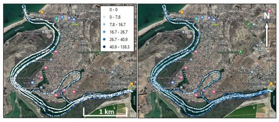 The overlays of the uranium concentrations for the energy window and full spectrum analysis methods are plotted in Figure 8. It is evident from the figure that the number of points with zero uranium concentrations is significantly lower in the full spectrum overlay than in the energy windows overlay. The patterns of uranium in the sediment are also more visible in the full spectrum analysis. Significantly elevated uranium concentrations are clearly noticeable close to the riverbanks in the upper part of the river where the influence of marine sediment is less. The full spectrum overlay, however, also demonstrates this better.